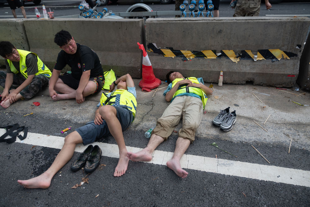 ↑7月22日,在阜外华中心血管病医院附近的锦绣路与郑开大道交叉口,工作多时的救援人员就地歇息。