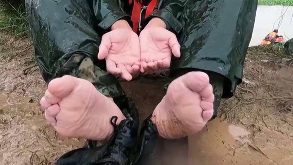 机动中队上士班长段少辉作为骨干力量,带头跳入河水中封堵管涌。由于长时间在水中浸泡,他的双手和双脚都已麻木发白。