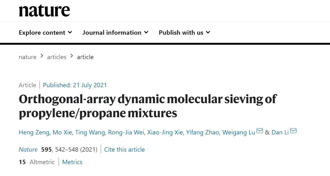 7月21日,国际顶尖学术期刊《自然》在线发表了暨南大学化学与材料学院陆伟刚教授和李丹教授研究团队的研究成果《Orthogonal-array dynamic molecular sieving of propylene/propane mixtures》,提出了一种新的分离机制——正交阵列动态筛分,实现了丙烯/丙烷分离领域的突破性进展,为设计下一代分离材料指出新方向。该研究未来可能广泛应用于石油化工、疫情防控、医疗卫生等多个领域。