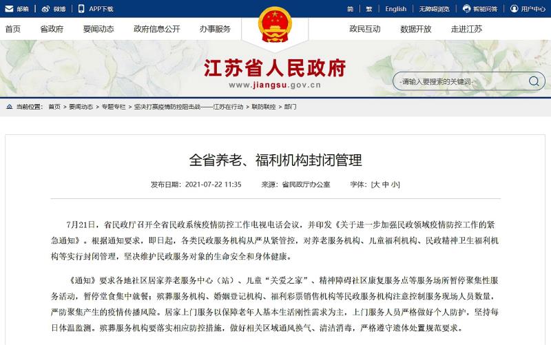 据江苏省民政厅办公室22日消息,日前,江苏省民政厅印发《关于进一步加强民政领域疫情防控工作的紧急通知》。根据通知要求,即日起,各类民政服务机构从严从紧管控,对养老服务机构、儿童福利机构、民政精神卫生福利机构等实行封闭管理,坚决维护民政服务对象的生命安全和身体健康。