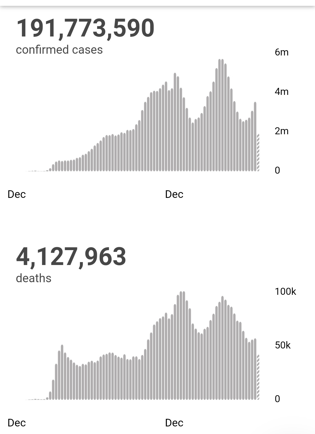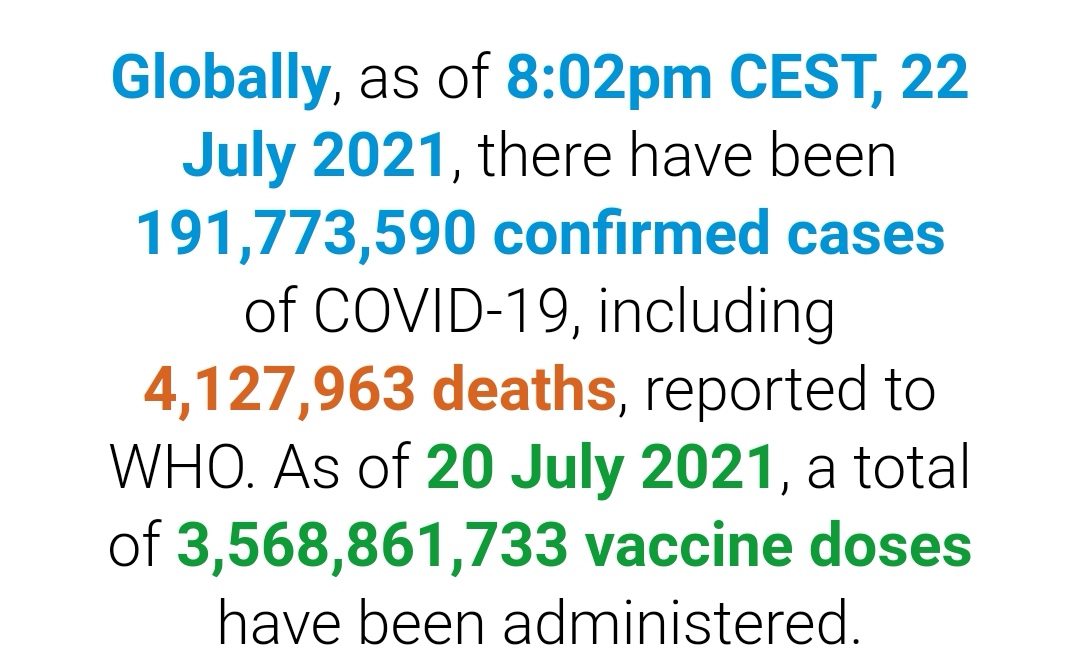 根据世卫组织最新实时统计数据,截至欧洲中部夏令时间7月22日20时02分(北京时间7月23日2点时2分),全球累计新冠肺炎确诊病例191773590例,累计死亡病例4127963例。21日全球新冠肺炎确诊病例新增512231例,死亡病例新增8644例。(总台记者 薛婧萌)