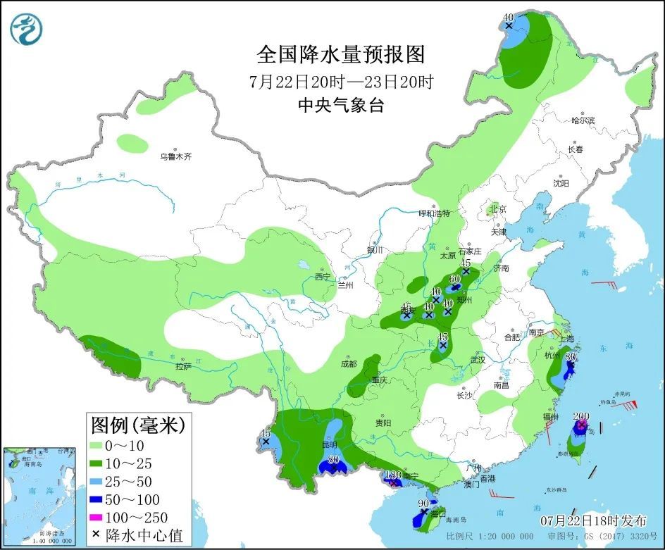 22日20时至23日20时,内蒙古东北部、黑龙江西北部、西藏南部、陕西南部、黄淮西部、浙江中东部、四川盆地东南部、云南、广西西南部和沿海、广东西南部、海南岛、台湾岛等地部分地区有中到大雨。