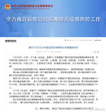 截至7月22日24时,据31个省(自治区、直辖市)和新疆生产建设兵团报告,现有确诊病例663例(其中重症病例17例),累计治愈出院病例87163例,累计死亡病例4636例,累计报告确诊病例92462例,现有疑似病例4例。累计追踪到密切接触者1072912人,尚在医学观察的密切接触者8742人。