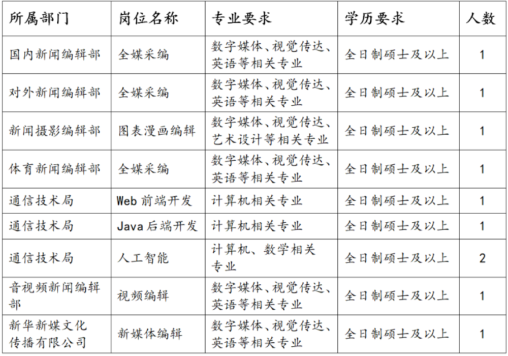 应聘者只可报考一个岗位,如有岗位调剂需求以新华社通知为准。