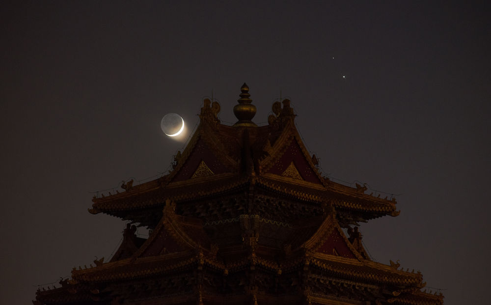 ↑北京市天文爱好者郑志2020年12月17日在故宫角楼拍摄的“土木伴月”。(本人供图)