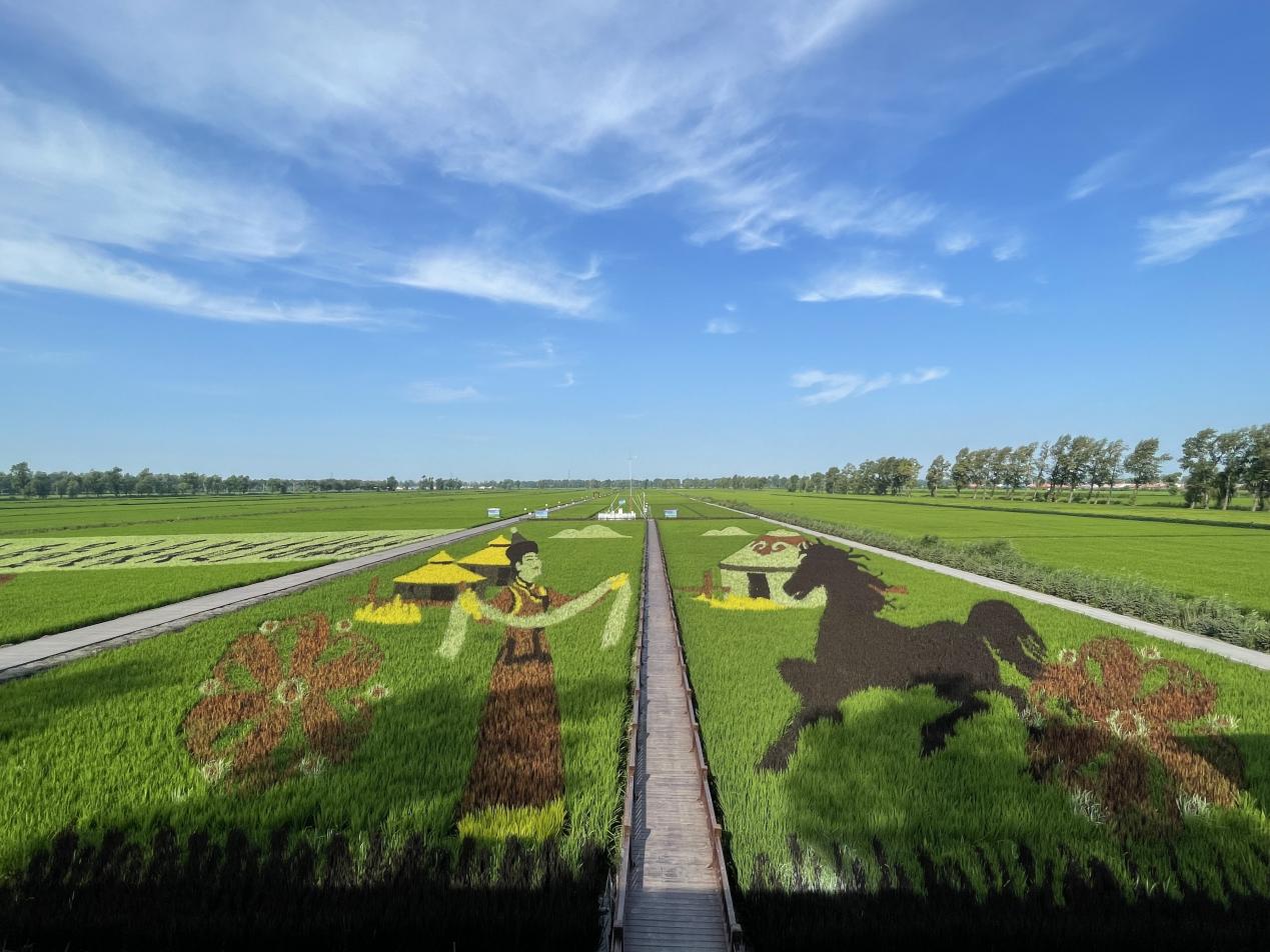 盛夏时节,田野里稻浪翻滚,一幅巨型稻田画随着微风摆动。