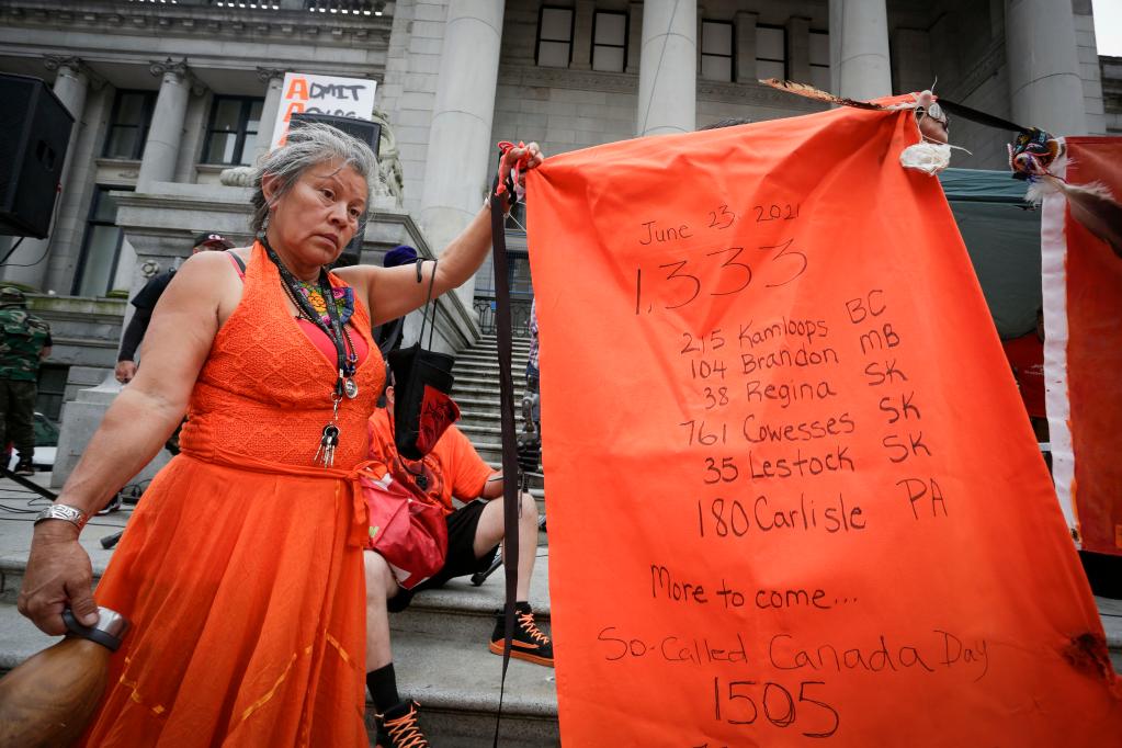 7月1日,原住民社团成员在加拿大温哥华举行的集会上展示近期加拿大多地发现原住民儿童遗骸的清单。新华社发(梁森摄)