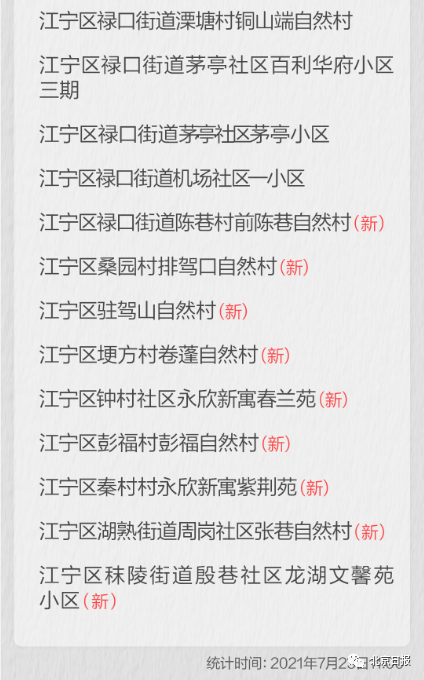 据南京市新冠肺炎疫情防控指挥部消息,自2021年7月23日起,对南京市部分区域疫情风险等级进行调整,南京新增1个高风险地区,新增9个中风险地区,中风险地区累计达到20个。