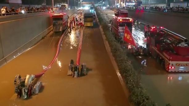 针对郑州市京广路航海路口隧道积水,救援人员立即展开排涝工作,两台“龙吸水”满负荷运转,8个多小时后,抽水排水已超过18000立方米,该地区水位线明显下降。