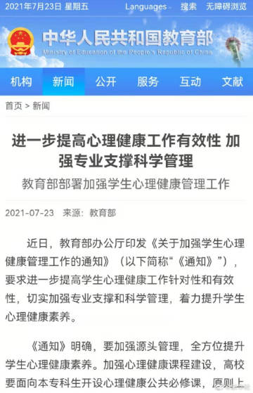 【#心理健康将成为必修课#】记者23日从教育部获悉,教育部办公厅近日印发通知,部署加强学生心理健康管理工作。通知要求,加强心理健康课程建设,高校要面向本专科生开设心理健康公共必修课,#中小学要将心理健康教育课纳入校本课程#,同时注重安排形式多样的生命教育、挫折教育。高校每年在新生入校后适时开展全覆盖的心理健康测评,县级教育部门牵头负责组织区域内中小学开展心理健康测评工作,每年面向小学高年级、初中、高中开展一次心理健康测评。(记者胡浩)