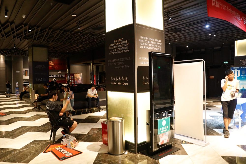 ↑7月22日,市民在郑州东方嘉禾影城大厅休息。新华社发(何五昌 摄)