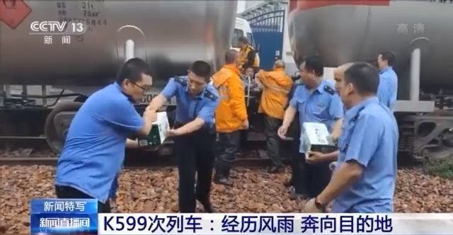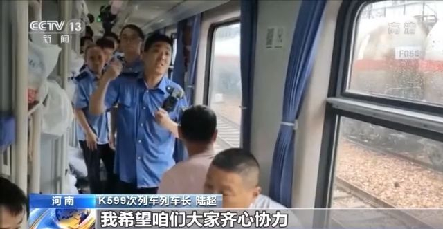 K599次列车列车长 陆超:现在的情况是这个地方也内涝了,我现在的物资有限,他们还在继续协调,还有第二批,咱们现在发放物资我只能是计划发放,咱们先紧重点旅客,老人、妇女、小孩先发放,不是特别紧需的青壮年男性,先等一等好不好。我希望咱们大家齐心协力,咱们配合好,咱们共渡难关好不好。