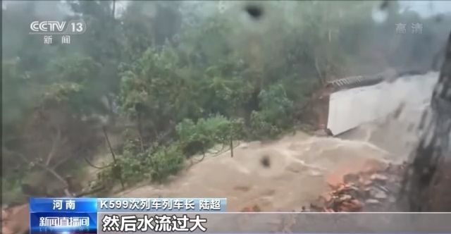 K599次列车列车长 陆超:20日列车运行至郑州南阳寨站至海棠寺站间临时停车。在临时停车过程中,我们4号车厢的乘务员崔家俊在巡视车厢时,发现运行机后4位运行方向,左侧防护墙被冲塌,水流过大。