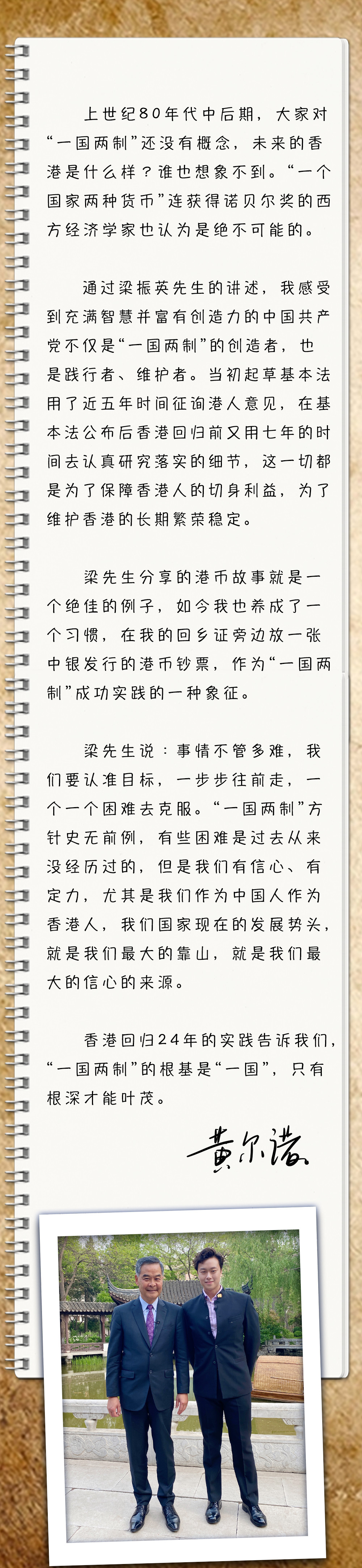 我叫黄尔诺,来自香港,一直以来我都把梁振英先生视为心中偶像。梁先生34岁时就担任基本法咨询委员会秘书长,39岁任特区筹委会预委会政务小组港方组长,41岁任特区筹委会副主任委员,全程参与了香港回归祖国的重要工作,我很想知道当年的他重任在肩,曾面临哪些压力和困难?当我有幸参与节目与他面对面交流时,没想到一张港币背后的故事让梁先生流泪了!