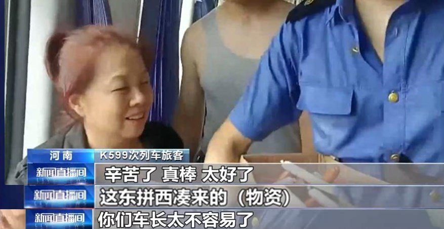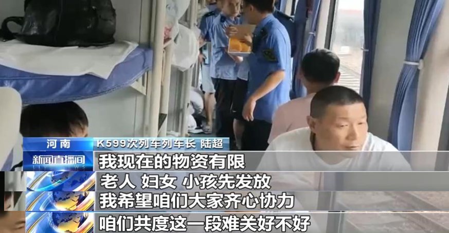 K599次旅客列车乘务组党支部号召全体工作人员省下一口饭少喝一口水,把有限的资源全部分发给旅客,并安抚旅客,共渡难关。