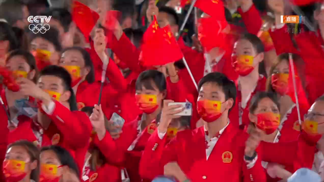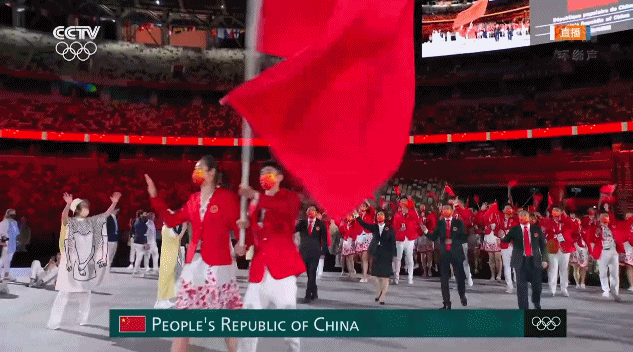 女排运动员朱婷、跆拳道运动员赵帅高擎五星红旗,中国体育代表团步入东京奥林匹克体育场。