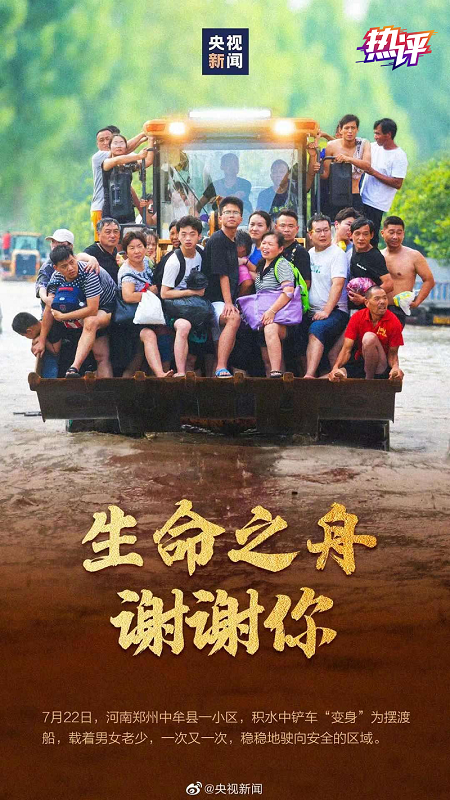 今天,一张“生命之舟”的照片刷屏,再度让人瞬间“破防”。洪流中,铲车变身摆渡船,载着男女老少,一次又一次稳稳驶向安全区域。画面中,人们团结一心驶向希望、目光笃定望向前方。