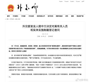 【#中方决定制裁7个美方人员和实体#】针对美方错误行径,中方决定采取对等反制,根据反外国制裁法对前美商务部长罗斯、美国会“美中经济与安全评估委员会”(USCC)主席卡罗琳·巴塞洛缪、“国会—行政部门中国委员会”(CECC)前办公室主任乔纳森·斯迪沃斯、“美国国际事务民主协会”金度允、“美国国际共和研究所”在港授权代表亚当·金、“人权观察”中国部主任索菲·理查森及“香港民主委员会”等7个美方人员和实体实施制裁。网页链接