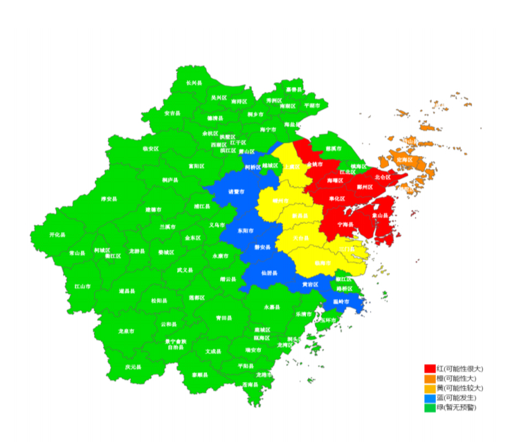 浙江省水利厅、浙江省气象局7月24日7时联合发布山洪灾害预警。根据浙江省气象台未来降雨预报,预计24日8时至25日8时,浙江柯桥区、诸暨市、磐安县、东阳市、黄岩区、仙居县、温岭市可能发生山洪灾害(蓝色预警),上虞区、新昌县、嵊州市、三门县、天台县、临海市发生山洪灾害可能性较大(黄色预警),定海区、普陀区、岱山县、嵊泗县发生山洪灾害可能性大(橙色预警),海曙区、北仑区、鄞州区、奉化区、象山县、宁海县、余姚市发生山洪灾害可能性很大(红色预警)。