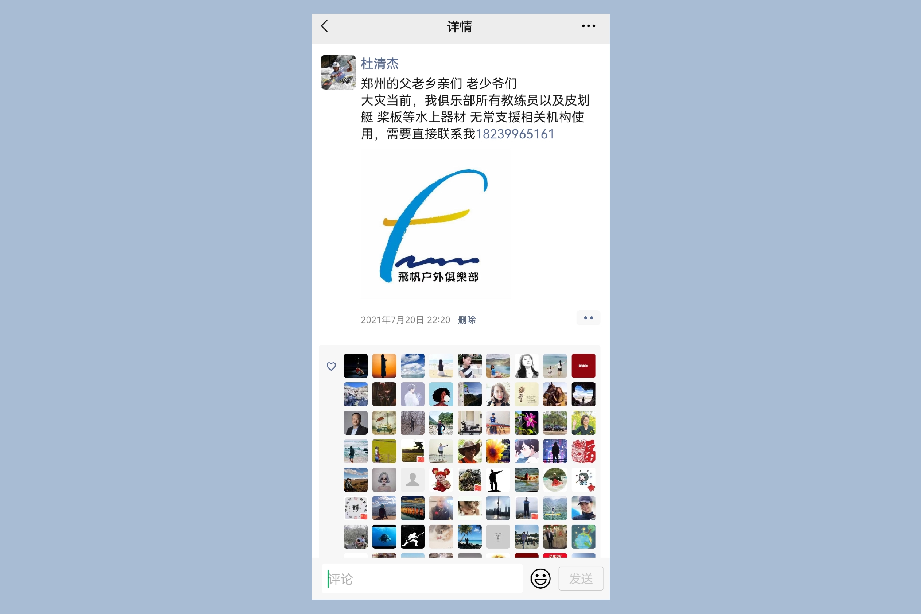 杜清杰是河南郑州皮划艇俱乐部负责人、原皮划艇激流回旋国家队教练。凭借着21年水上运动经验,他迅速察觉到强降雨带来的危险性,并第一时间将自己的联系方式发到朋友圈,无偿支援皮划艇、桨板、救生衣等物资。