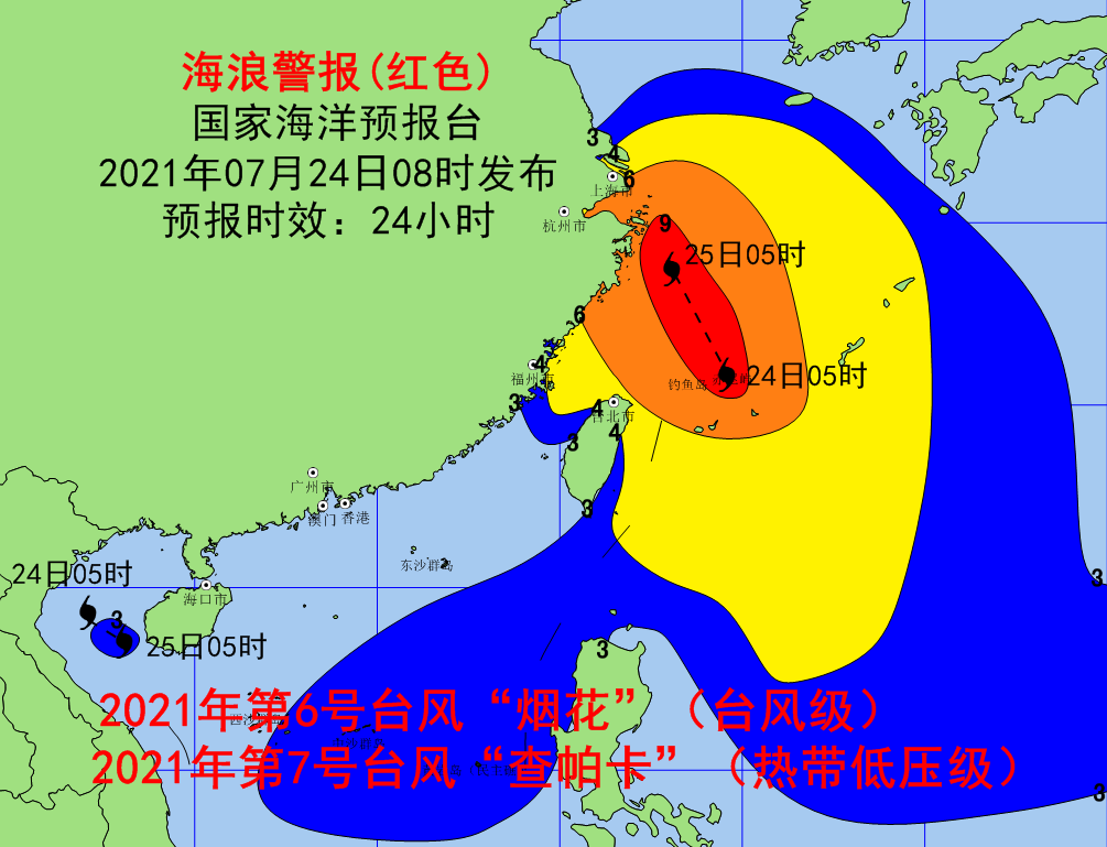 海浪方面,预计7月24日中午到25日中午,东海南部、钓鱼岛附近海域将出现6到10米的狂浪到狂涛区,东海北部将出现5到7米的巨浪到狂浪区,近海海域海浪预警级别为橙色;上海、浙江近岸海域将出现5到7米的巨浪到狂浪,该近岸海域海浪预警级别为红色,福建北部近岸海域将出现3到4.5米的大浪到巨浪,该近岸海域海浪预警级别为橙色,江苏南部近岸海域将出现2.5到3.5米的大浪,该近岸海域海浪预警级别为黄色,江苏北部、福建南部近岸海域将出现2到3米的中浪到大浪,该近岸海域海浪预警级别为蓝色。