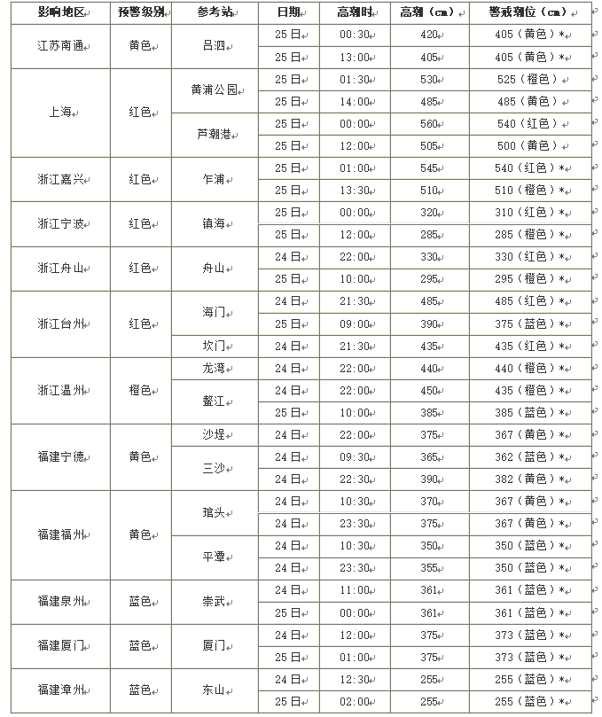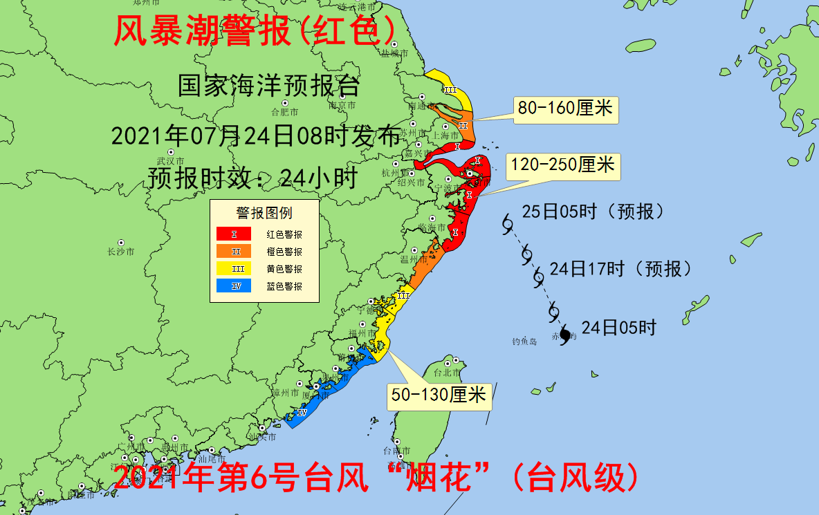 受台风“烟花”(台风级)的影响,预计7月24日上午至25日中午,江苏南部到上海沿海将出现80到160厘米的风暴增水,浙江嘉兴到台州沿海将出现120到250厘米的风暴增水,浙江温州到福建漳州沿海将出现50到130厘米的风暴增水。上海市、浙江嘉兴市、绍兴市、宁波市、舟山市和台州市的风暴潮预警级别为红色,浙江温州市的风暴潮预警级别为橙色,江苏南通市、福建宁德市和福州市的风暴潮预警级别为黄色,福建莆田市、泉州市、厦门市和漳州市的风暴潮预警级别为蓝色。