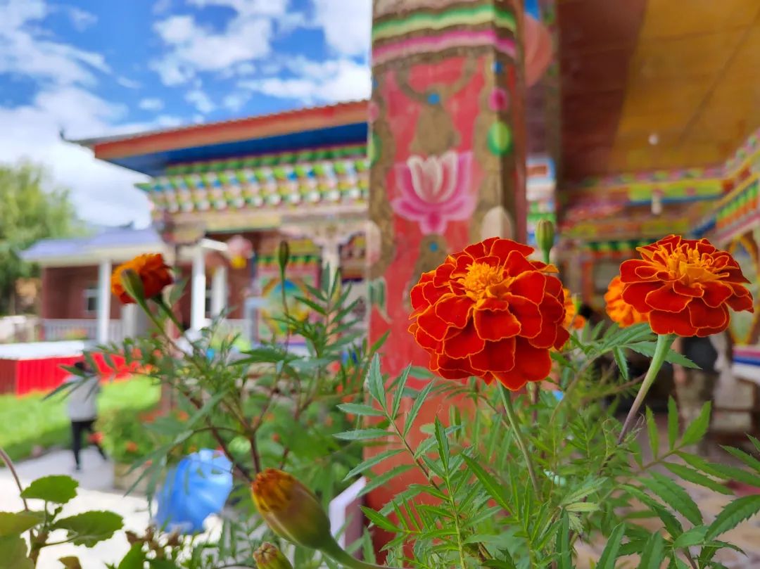 行走在村道上,视野逐渐开阔。来到村民扎西邓珠家,院子里的橘色小花开得如火如荼。自启动农村人居环境整治工作以来,龙古村积极开展美丽庭院行动,鼓励村民们在自家房前屋后栽花种草,家家户户花开不断,芬芳四溢。