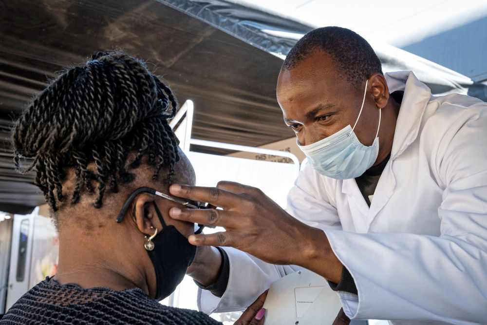 2020年9月10日,在南非约翰内斯堡的流动火车车厢医疗站内,一名医生为患者检查视力。新华社发(耶希尔摄)
