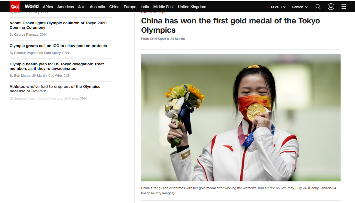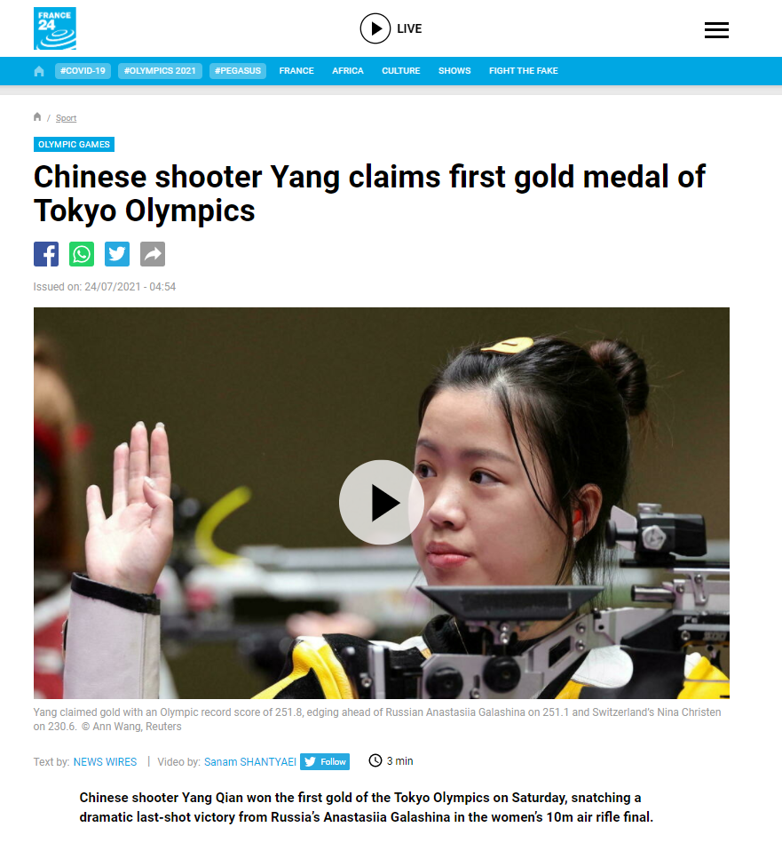 7月24日上午,东京奥运会射击女子10米气步枪决赛在日本东京朝霞射击场进行。中国选手杨倩以251.8环拿下金牌!