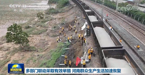 陇海铁路的抢险也在加紧进行。受强降雨影响,铁路沿线出现上百处路基塌陷、边坡溜坍、道床冲空等严重险情,截至目前,上行线已经抢修开通,恢复行车。