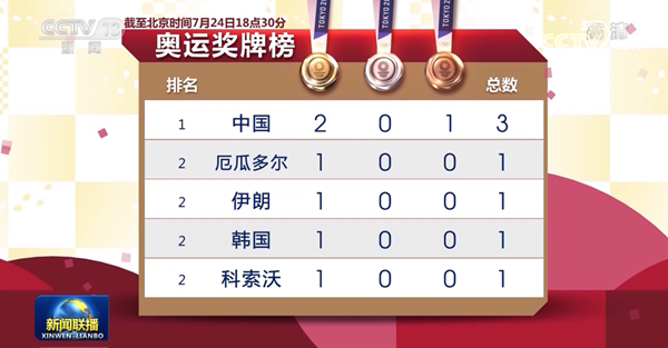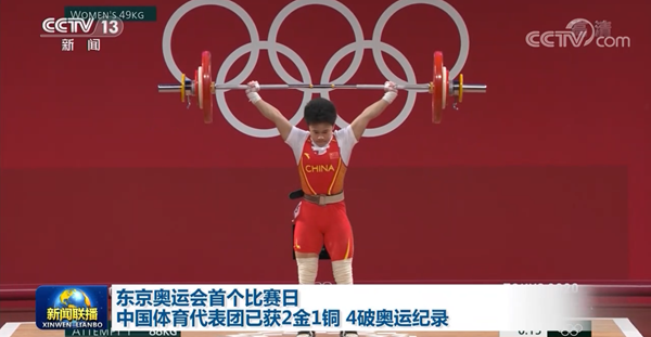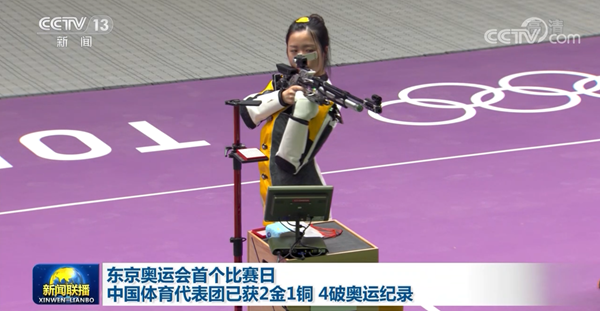 央视网消息(新闻联播):东京奥运会今天(7月24日)迎来开幕式后第一个比赛日的争夺。截至目前,中国体育代表团已经在射击、举重项目的比赛中夺得2枚金牌1枚铜牌,4次打破奥运会纪录。在女子10米气步枪的比赛中,杨倩摘得本届奥运会的首枚金牌,为中国体育代表团取得开门红。