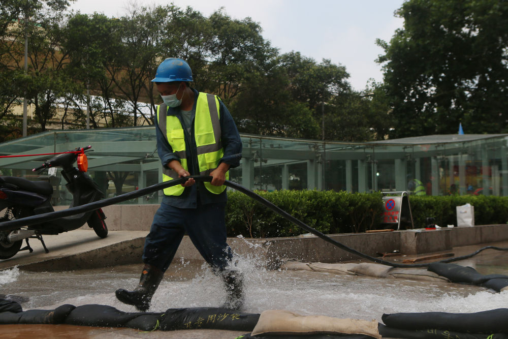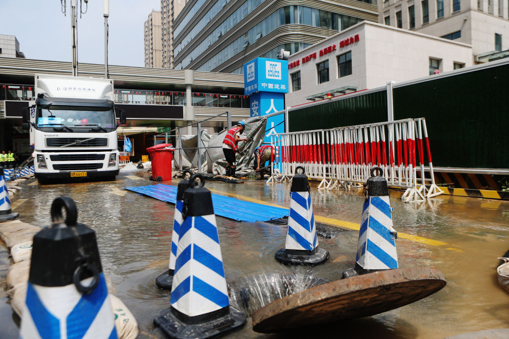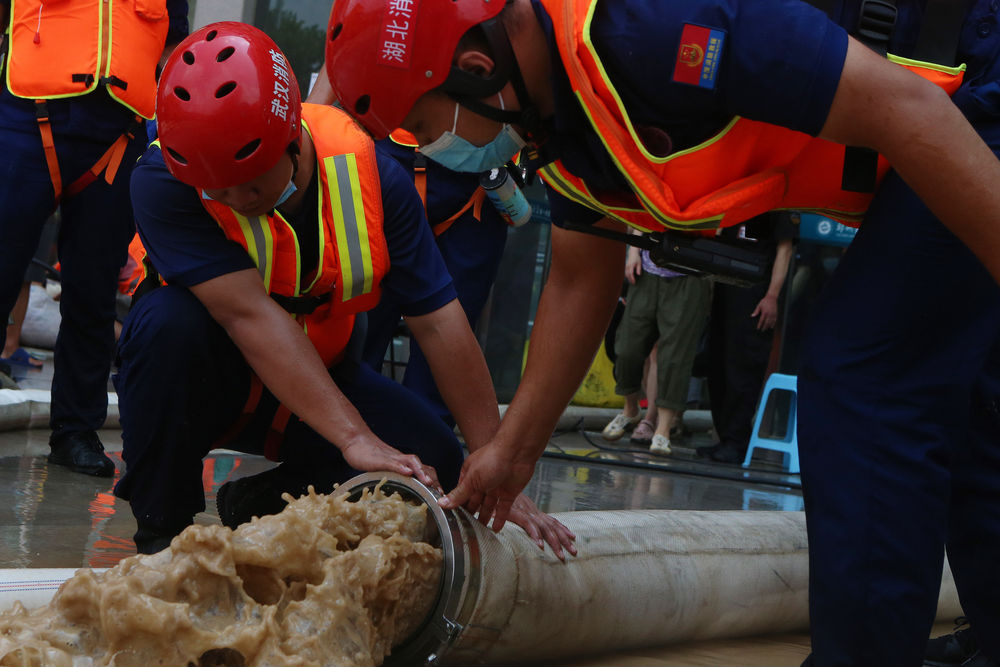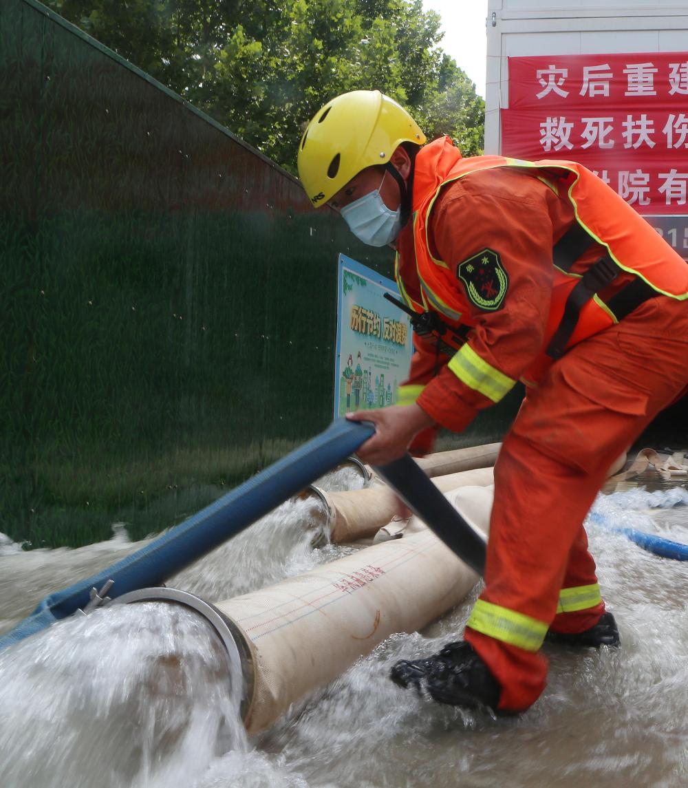 7月24日,在郑州大学第一附属医院河医院区,救援人员进行排水作业。