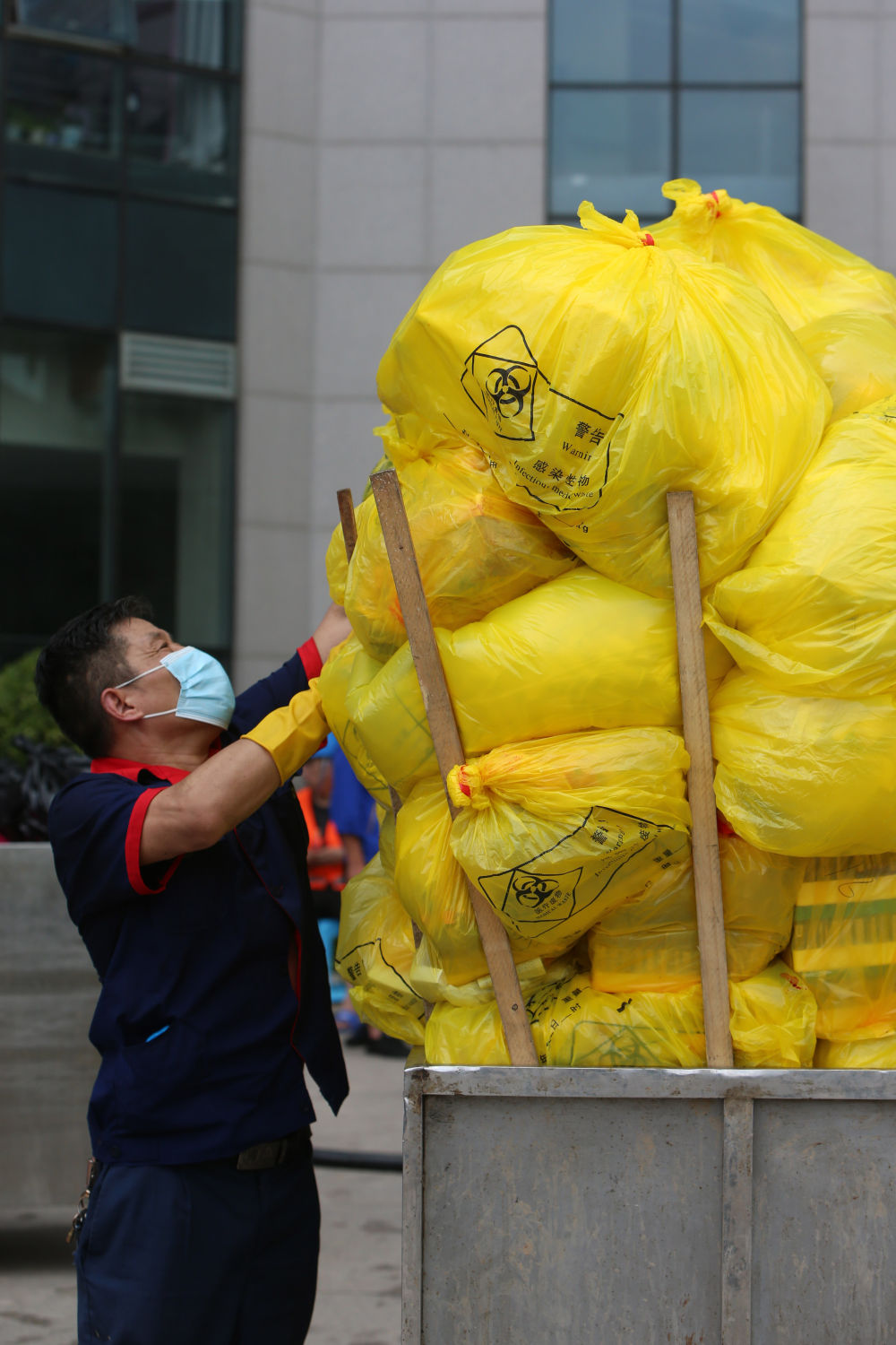 7月24日,在郑州大学第一附属医院河医院区,工作人员在清运垃圾。