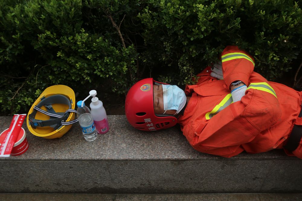 7月24日,在郑州大学第一附属医院河医院区,救援人员在工作间隙休息。