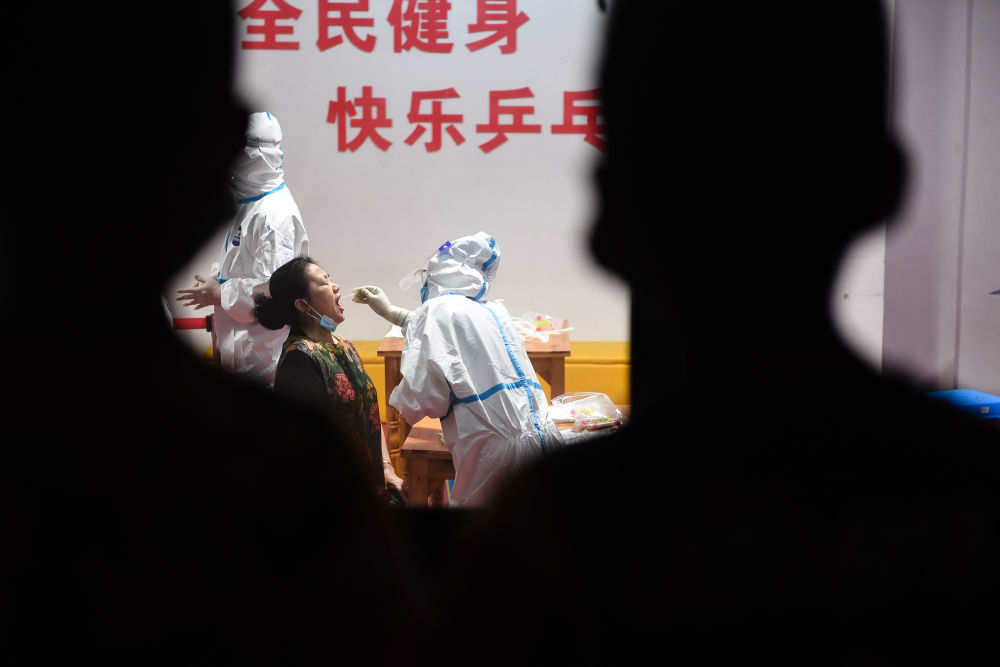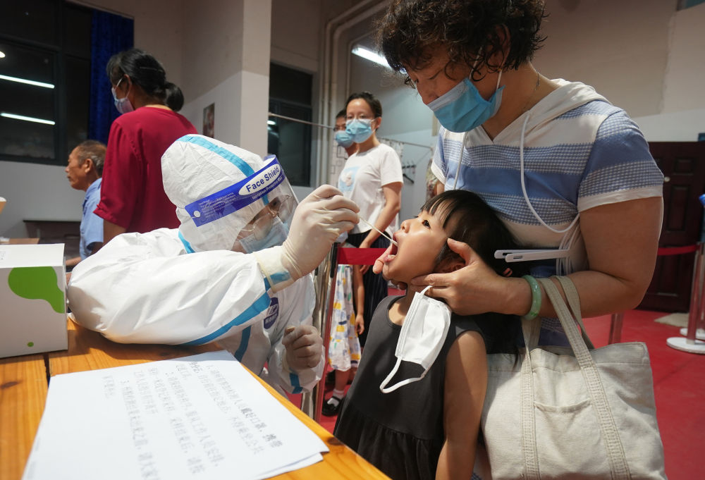 ↑7月24日,在南京江宁区高尔夫国际花园小区检测点,医生在为居民进行核酸检测取样。
