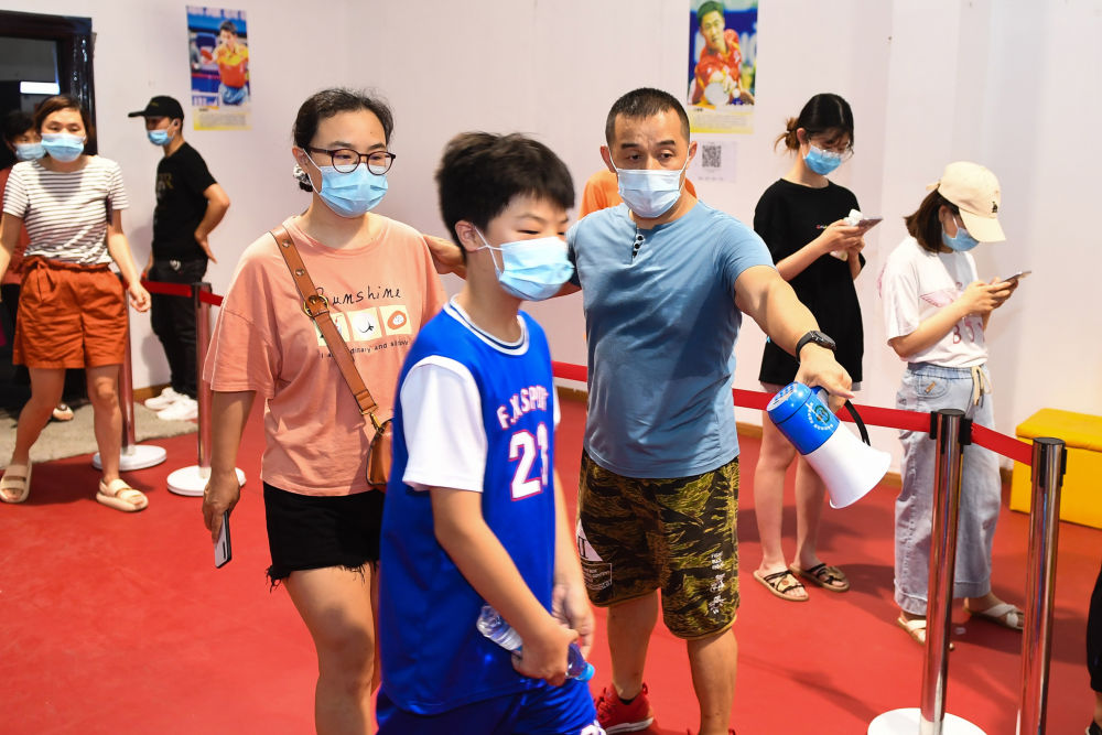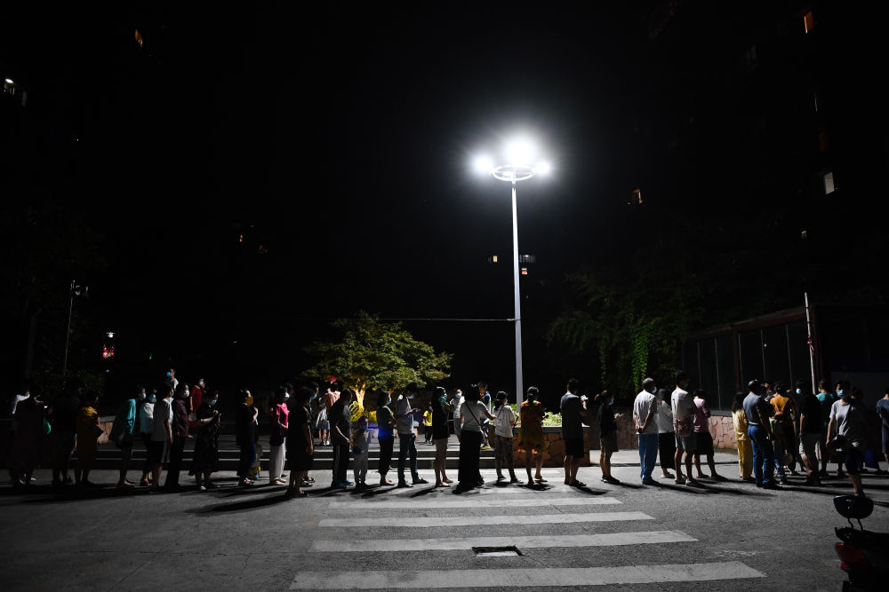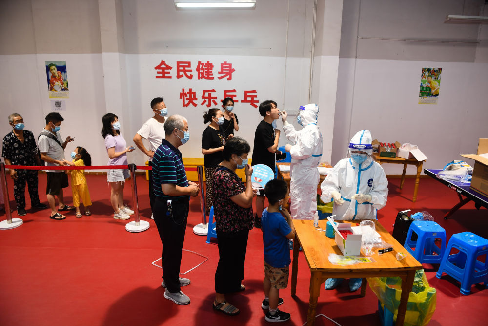 ↑7月24日,在南京江宁区高尔夫国际花园小区检测点,居民排队等待检测。