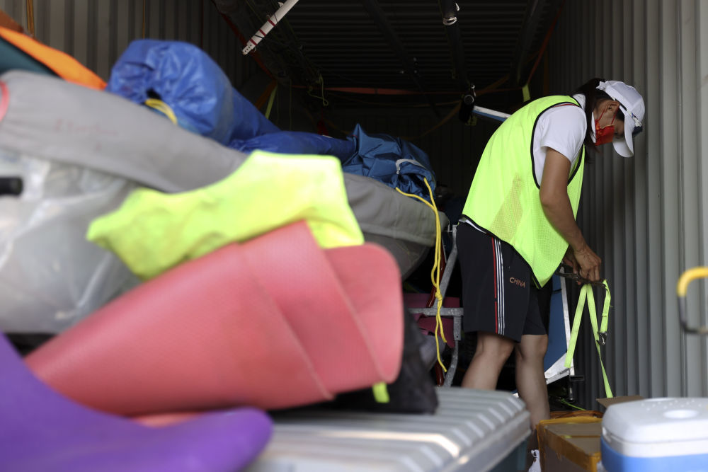 7月11日,中国女子帆板运动员卢云秀在集装箱内整理物资。新华社记者李明摄