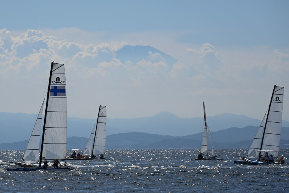 7月20日,参加诺卡拉17级帆船比赛的运动员在江之岛游艇码头附近的海域训练,远处为日本富士山。新华社记者黄宗治摄