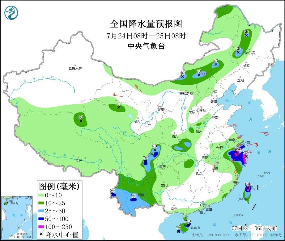 7月24日08时至25日08时,浙江中北部和东部、上海、台湾岛中北部、海南岛东北部和西南部、四川盆地西部、云南南部以及湖北西北部、内蒙古中东部、吉林西部、黑龙江西部等地的部分地区有大雨或暴雨,其中,浙江北部和东北部沿海、台湾岛北部的局部地区有大暴雨。江苏南部部分地区有6~7级风,浙江北部部分地区有7~8级风。