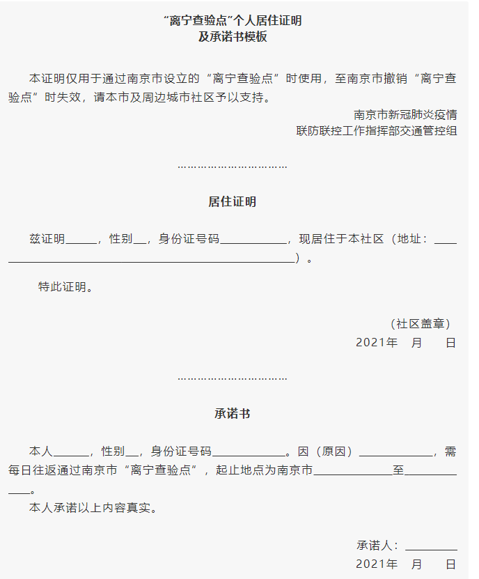 7月25日上午7时起,南京将设立公路“离宁查验点”,为保障群众便利出行和保供运输高效通行,南京公布用于通过“离宁查验点”的通行依据模板:
