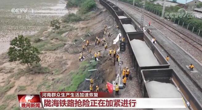陇海铁路的抢险也在加紧进行。受强降雨影响,铁路沿线出现上百处路基塌陷、边坡溜坍、道床冲空等险情。截至目前,上行线已经抢修开通,恢复行车。