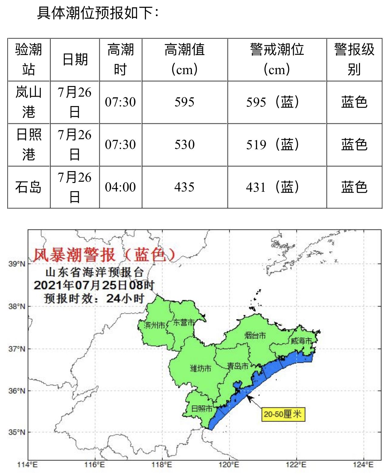 受今年第6号台风“烟花”(台风级)外围影响,预计7月25日中午至26日上午,山东半岛南部沿岸将出现20~50厘米的风暴增水。岚山港、日照港和石岛验潮站将出现达到当地蓝色警戒潮位的高潮位。山东省日照市和威海市预警级别为蓝色。