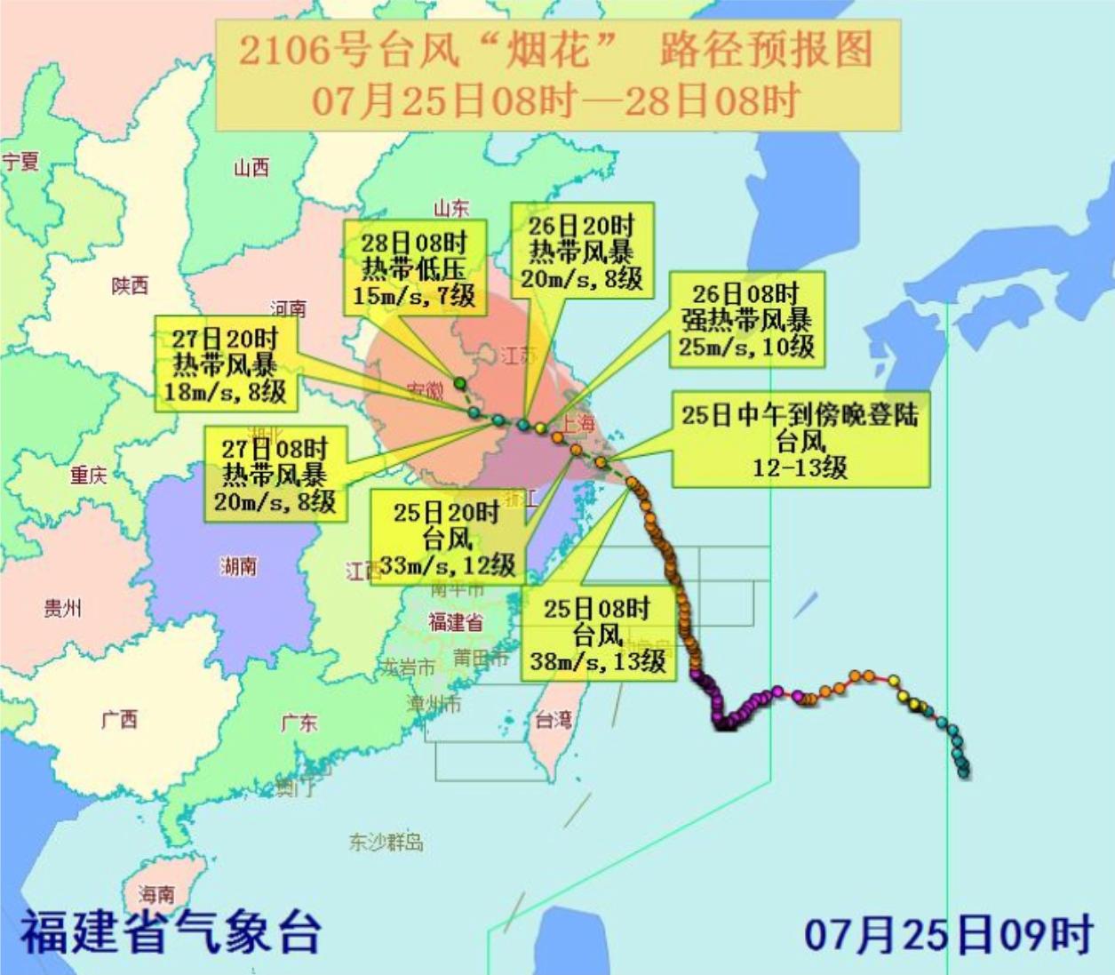 台风“烟花”今天(7月25日)9时中心位于浙江省舟山市东偏南方约80公里的海面上。据气象预测,“烟花”将以每小时15~20公里的速度向西偏北方向移动,将于今天中午到傍晚在浙江象山到江苏启东一带沿海登陆(台风级,12~13级,33~38米/秒),登陆后强度逐渐减弱,并有可能在华东地区回旋。