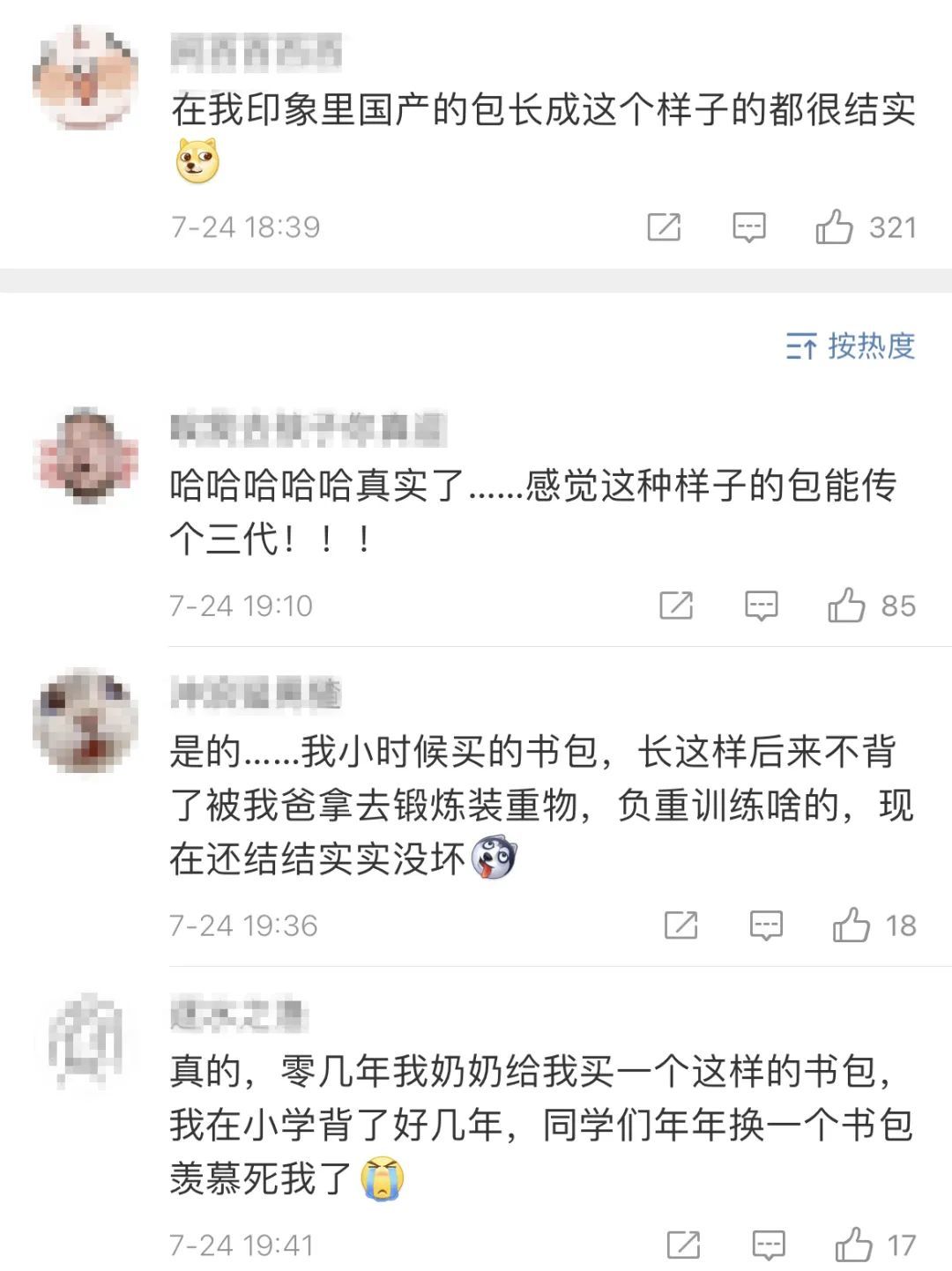 一看到这眼熟的国产背包款式,网友的反应太好笑了:“长成这种样子的国产书包是可以祖祖辈辈传承下去的”“小时候买了个这样的书包,这辈子再没换过”。