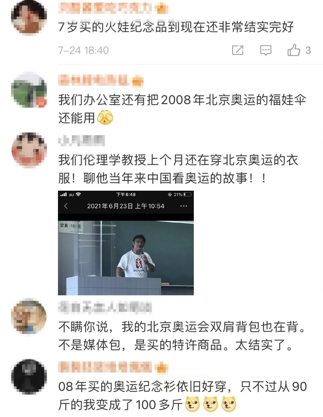 还有很多网友分享自己也在北京奥运会时期买过相关周边,质量奇好,至今仍能正常使用,“笑死,人胖一圈了衣服都还能穿。”