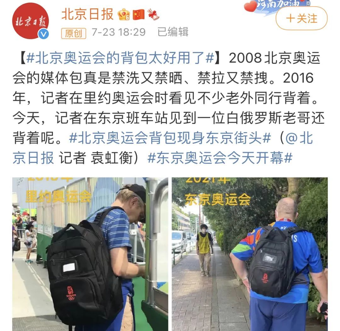 据@北京日报 23日报道,记者在东京班车站看到一位白俄罗斯的男士背着北京奥运会上发的背包,感慨北京奥运会发的媒体包“真是禁洗又禁晒,禁拉又经禁拽,简直太好用了。”