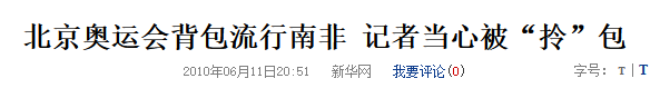 2010年新华社记者要去南非报道世界杯时,全员都背着北京奥运会的媒体包,还特地在标志处插上了五毛人民币与其他人区分开。