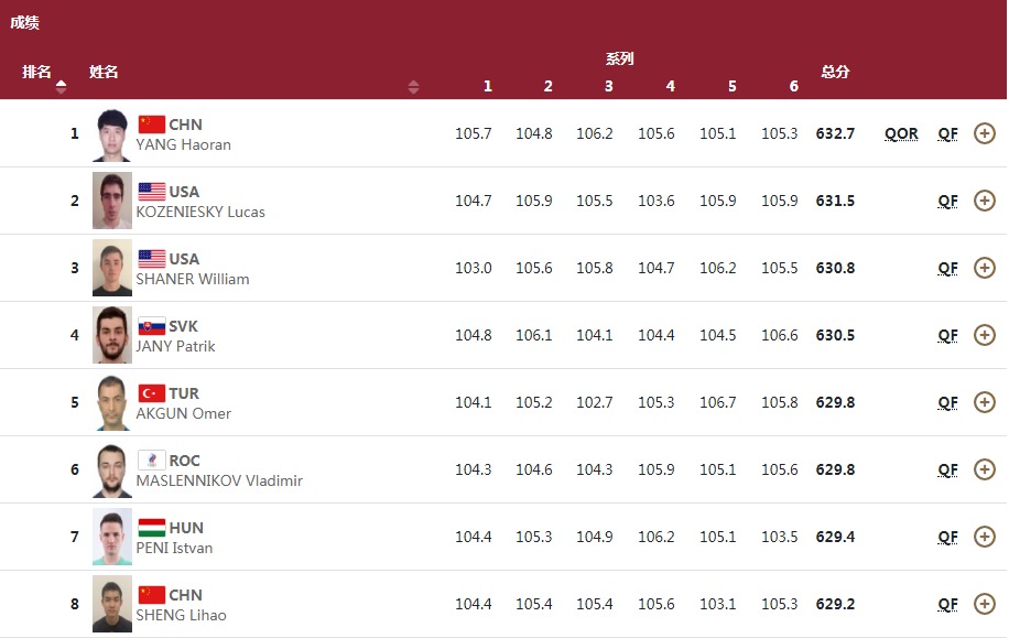 北京时间7月25日下午,东京奥运会射击男子10米气步枪资格赛,中国选手杨皓然以632.7环的成绩打破资格赛奥运会纪录,排名第一跻身决赛,盛李豪以629.2环排名第八晋级。