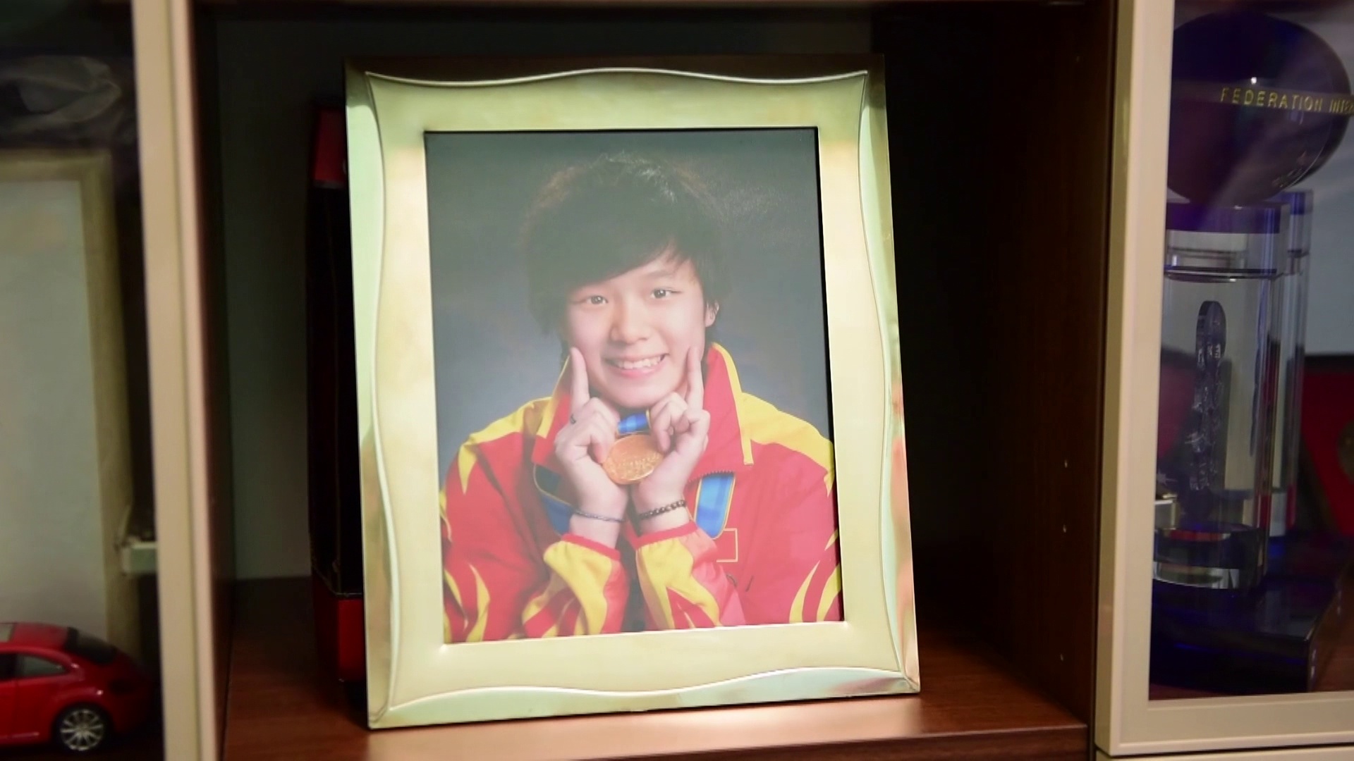 奖杯、奖牌、参赛证,还有施廷懋从各地带回来的纪念品,都被父母分门别类放在了书柜里。但可以明显感觉到,施廷懋在家里的生活痕迹很少,相册也基本只有她九岁以前的照片。施廷懋的父亲施晓林告诉记者,五岁那年,重庆体委到幼儿园挑选练体操的好苗子,施廷懋中选。八岁那年,她又改练跳水。但在一开始,他并没有想过让女儿走体育这条路。
