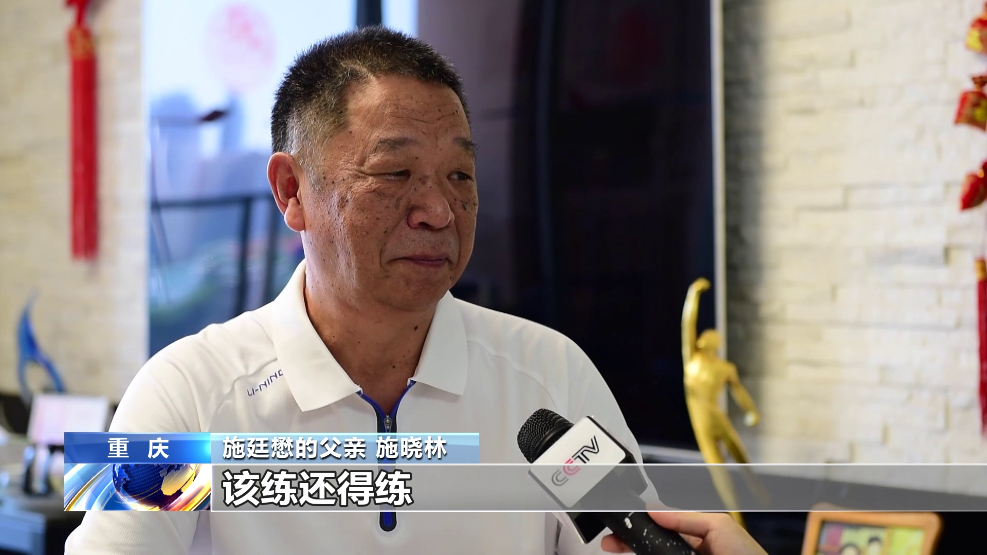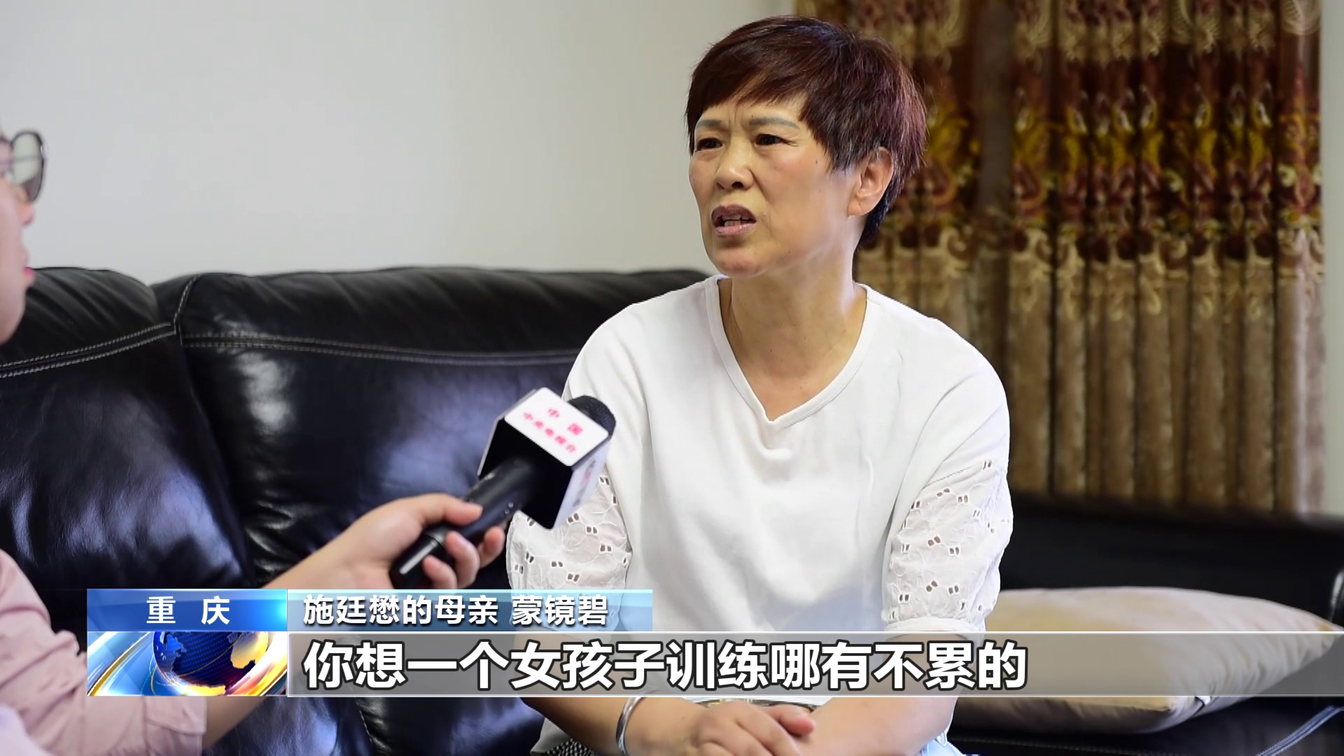 施廷懋的父亲 施晓林:我知道运动员的辛苦。她练体操一个星期过后,我才去看她训练。我看到别的孩子要拉韧带,都被教练“整”哭了,我孩子就没有哭。完了过后我就问她为什么没有哭,她说,哭有什么用,该练还得练。那我说你喜不喜欢呢?她说喜欢。从那时开始,我就再也没有反对过她练体育,从那个时候开始,我们就全力以赴地支持她。
